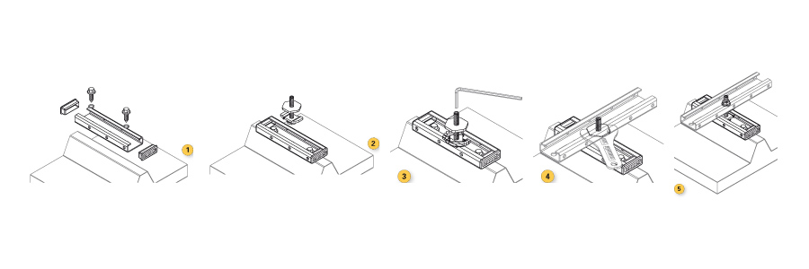 It uses self-tapping screws and can be adjusted both horizontally and vertically (see drawing).