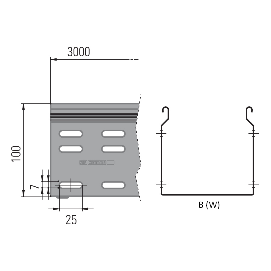 Dimension brush Thickness Conductor section Weight Length SWL (N/m) as function of the span (S) [m] -EN 61537 Usable section of channel [mm²] - EN 50085-2-1 Minimum distance Bottom slots Code