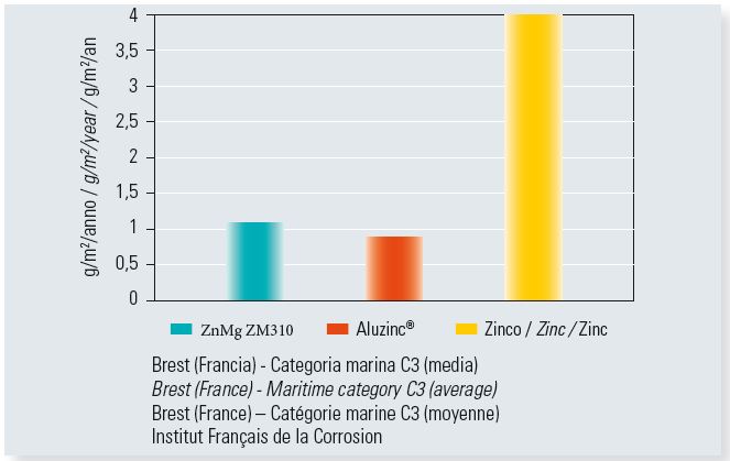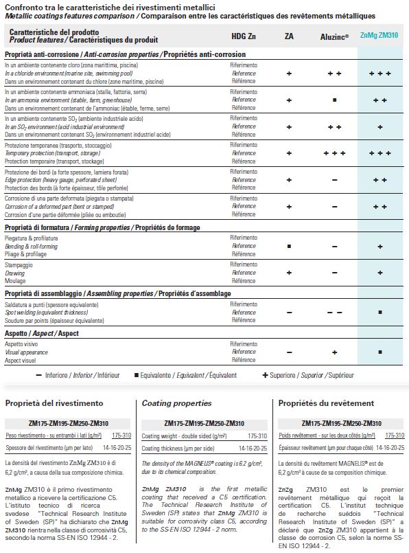 A seconda dell’ambiente a cui è esposto, ZnMg ZM310 consente di ottenere una significativa riduzione del peso del rivestimento, pari a due/quattro volte rispetto ai prodotti post-zincati, a fronte di prestazioni decisamente superiori sul piano della resistenza alla corrosione e dell’efficienza dei costi.