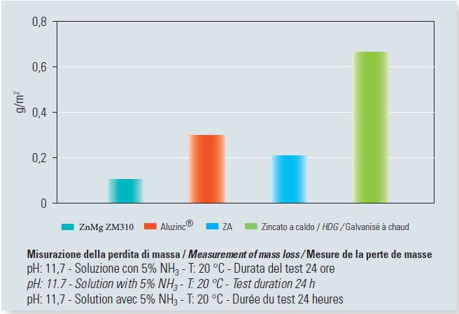 Anche in ambienti altamente alcalini – caratterizzati da un pH compreso tra 10 e 13 – la resistenza alla corrosione di ZnMg ZM310 è risultata superiore rispetto a quella offerta da altri rivestimenti metallici.