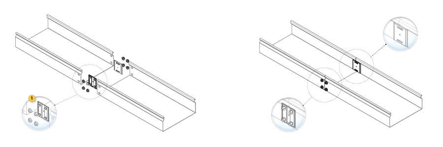 Inside the trunking, the heads of the bolts are recessed and protected by a plate (1) which makes it possible to pull electric cables without fear of damaging them.